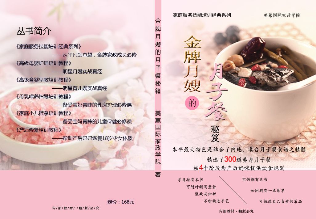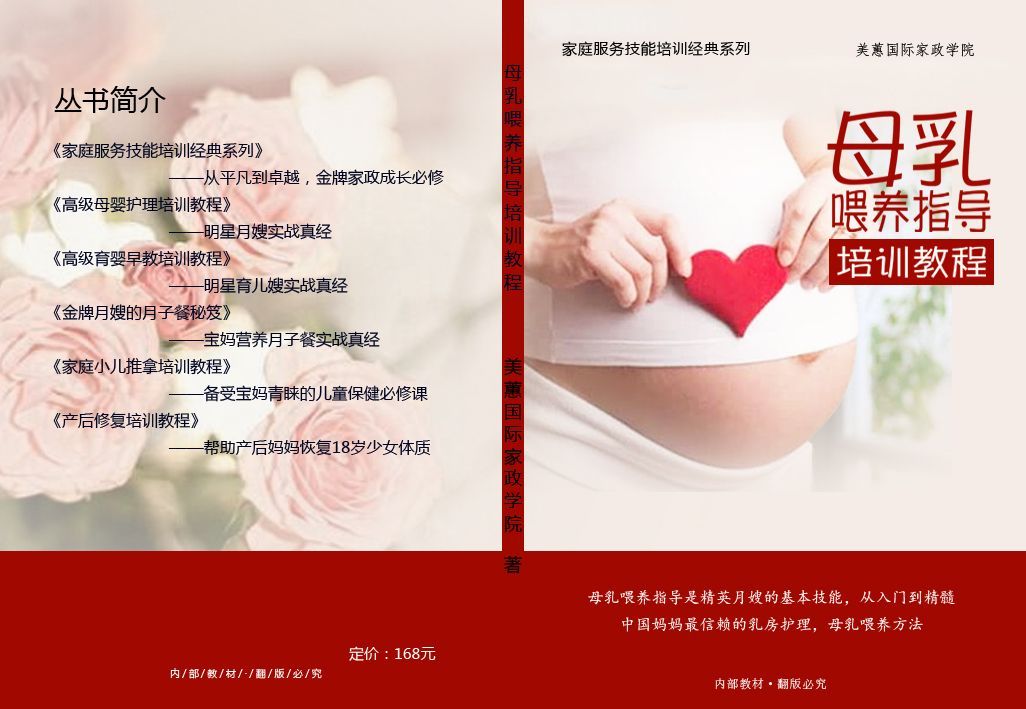 出版《金牌月嫂月子餐秘笈》、《母乳喂养指导师》、《母婴护理》、《小儿推拿》等多部教材包,每个教材包里包含了纸质教材和视频课程,让学员的学习更加简单。